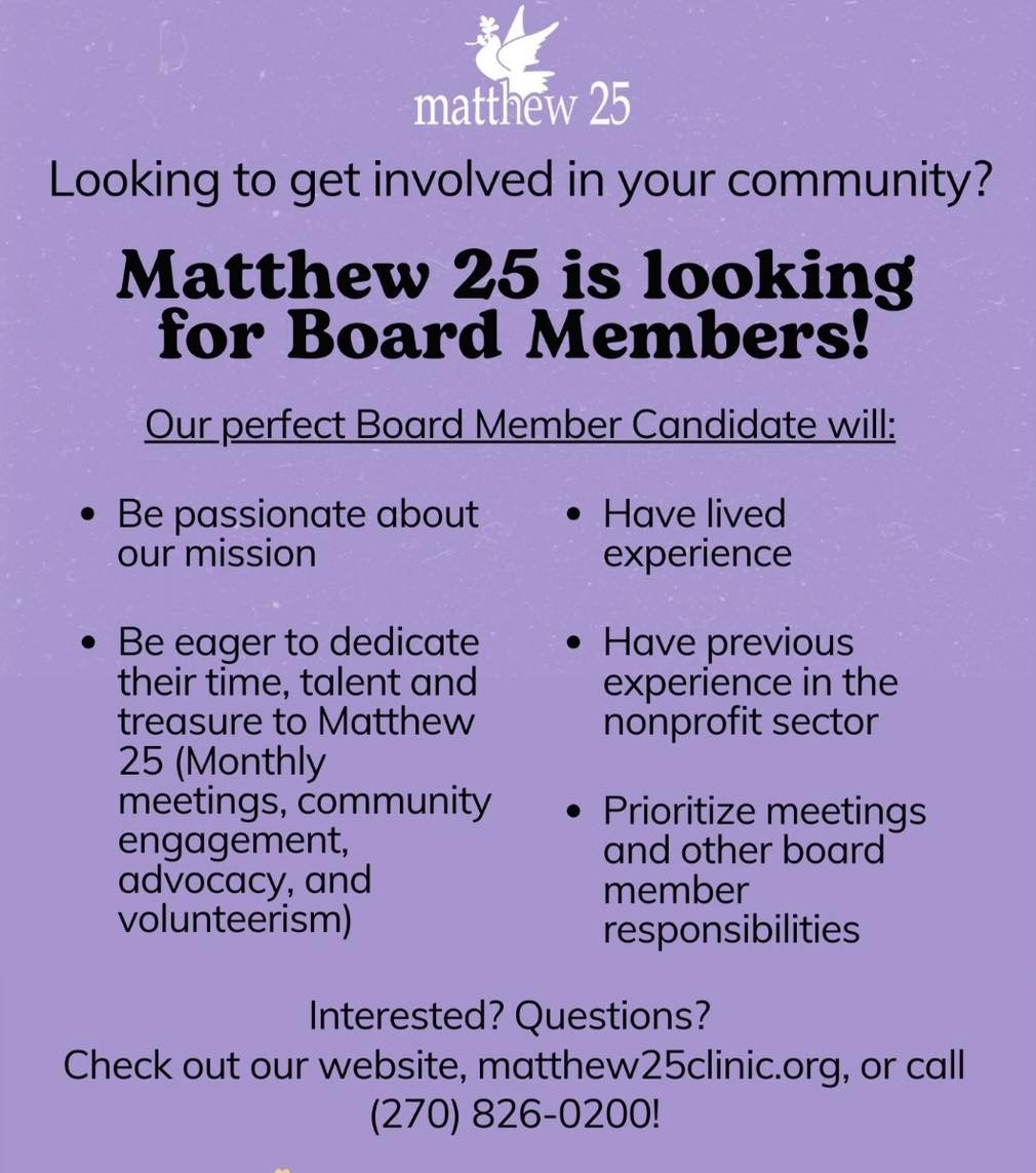 We are seeking additional Board Members! If you’re looking for a fulfilling way to get involved with Matthew 25 and have experience in the non-profit sector, you may be an ideal candidate.